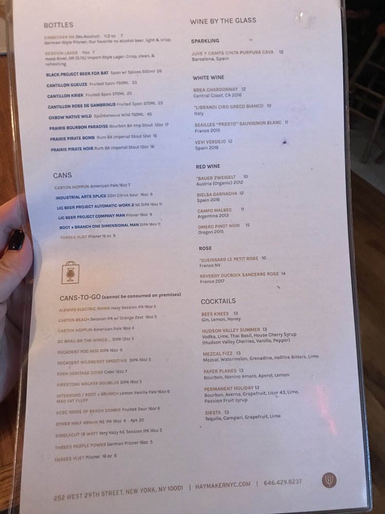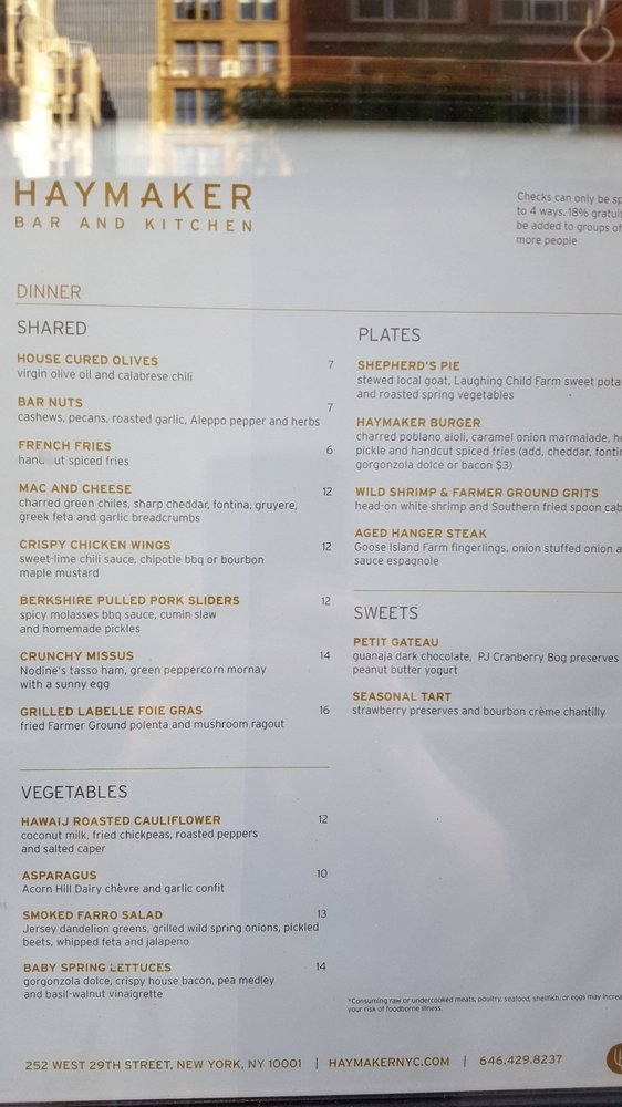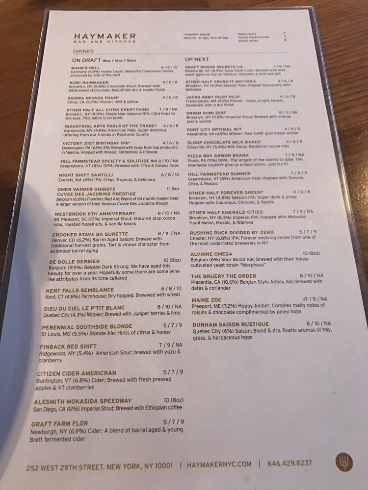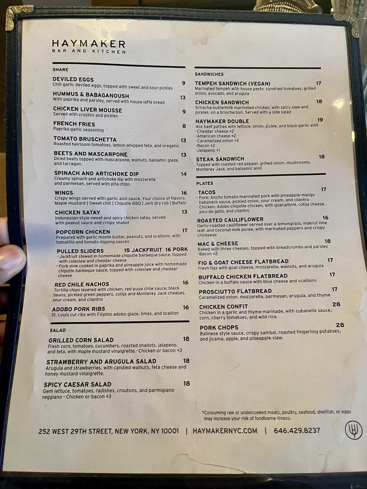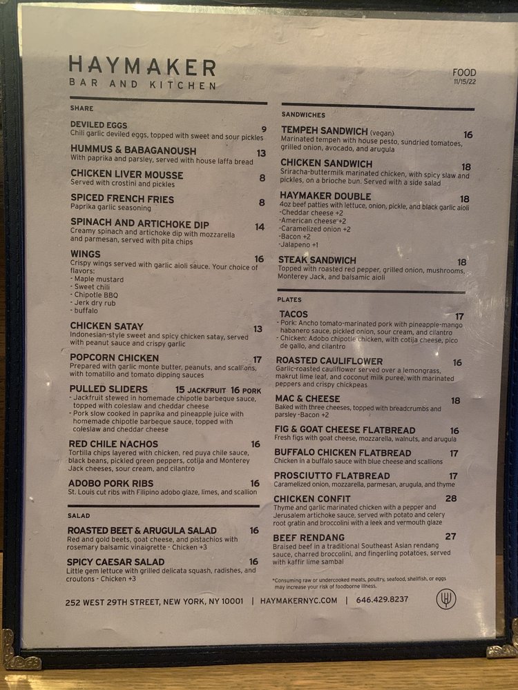 Introducing the menu at Haymaker Bar, a standout gastropub in New York City's dining scene. Known for its modern ambiance and upscale bar food, this spot offers a variety of small plate options and delicious entrees. From the Southwest Asian-inspired nachos to the juicy burgers, the menu caters to diverse tastes. The extensive cocktail, wine, and beer lists impress with their vast and diverse selections. Noteworthy dishes include the Spicy Pineapple Margarita and the buffalo chicken flatbread. The service is friendly and attentive, adding to the overall enjoyable experience. Whether you're looking for a casual meal, group drinks, or a place to unwind after an event, Haymaker Bar is the perfect choice. Head over for a memorable dining experience that will leave you coming back for more!
